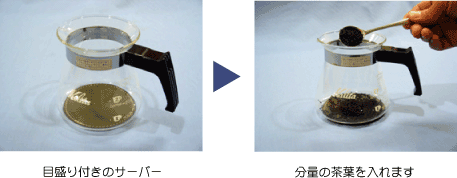 目盛りの付いたサーバー(無ければティーポット)に分量の茶葉を入れます。